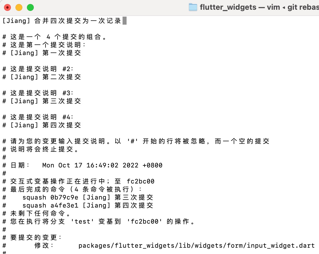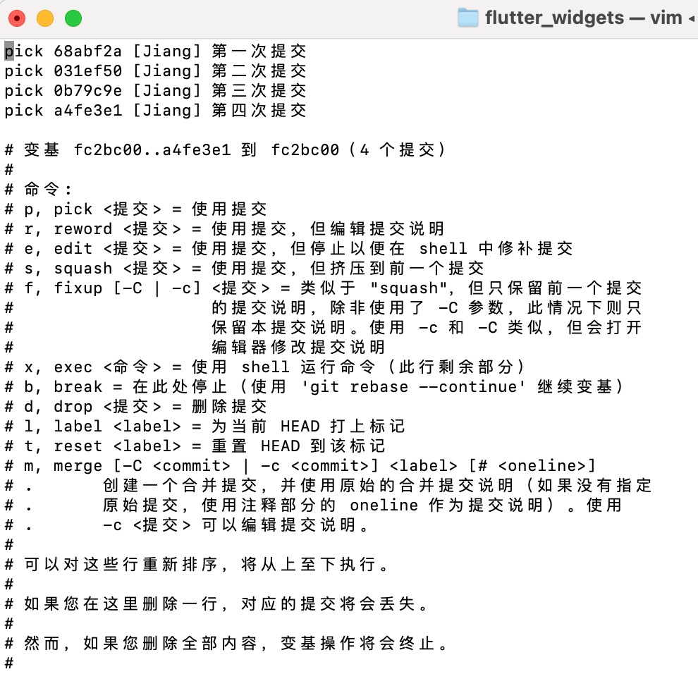 i进入编辑模式,并将后面3条记录的pick改为s或squash。 - 按